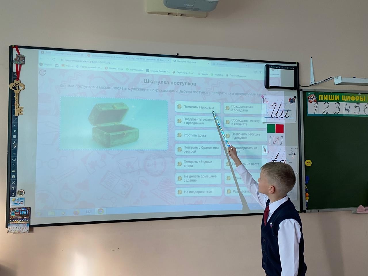 Уважению был посвящён классный час «Разговоры о важном», проходивший в классах нашей школы 6 октября. Во всех классах смотрели видео, выполняли интерактивные задания. Учащиеся младших классов собирали поступки, связанные со словом УВАЖЕНИЕ, в волшебный сундучок, Ребята постарше выполняли задания на рабочих листах, говорили об уважении к учителю, соединяли начала и концы пословиц, вспоминали известных людей нашей страны, достойных особого уважения.
