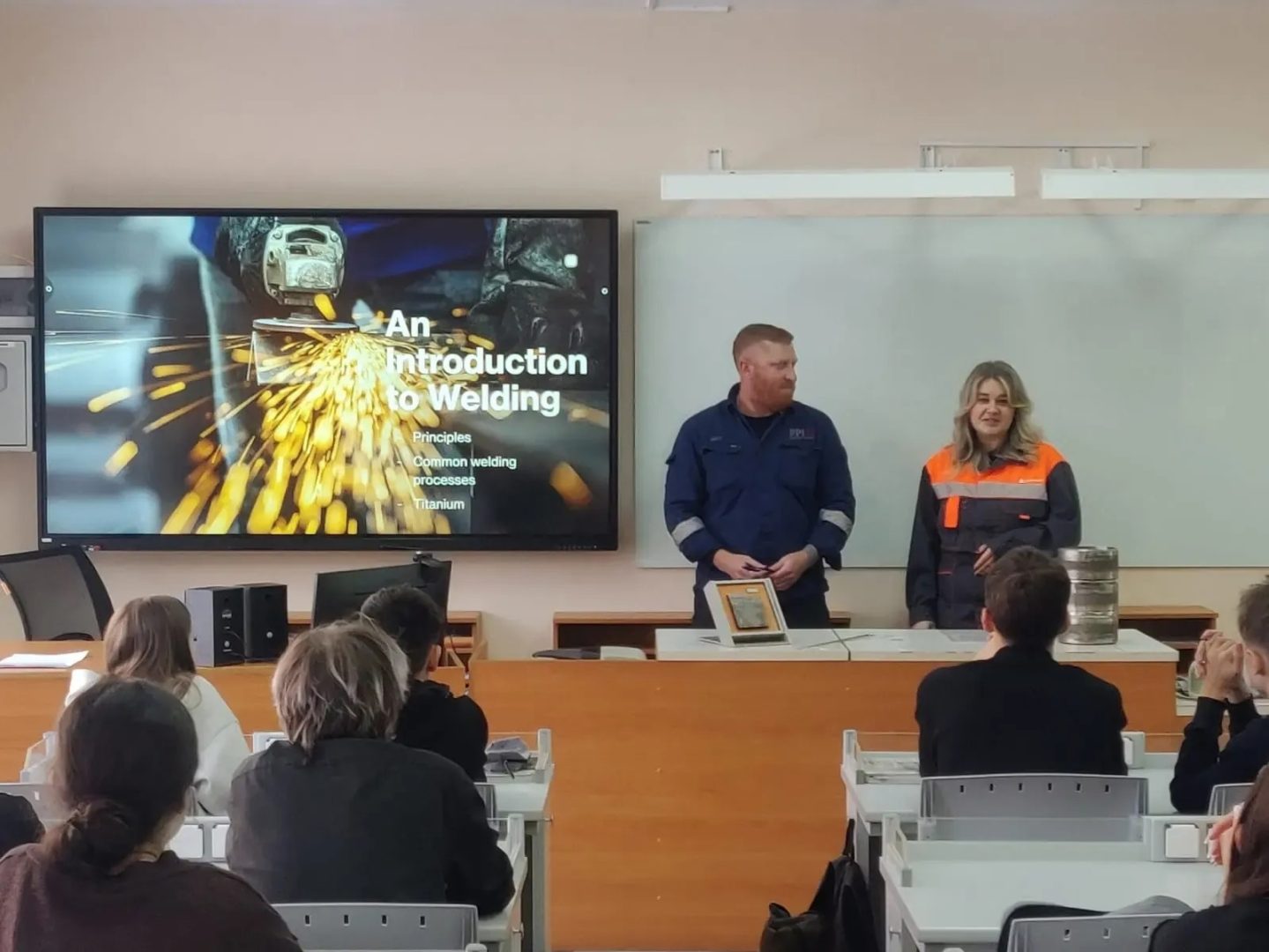 Ребятам Бретт рассказал об этапах создания автоклава, стенки которого изготовлены из титана. Рассказал о сложностях создания подобных конструкций и способах их решения. Ребята смогли увидеть и потрогать образцы материалов, из которых состоит автоклав. Еще Бретт рассказал, что сегодня в профессию сварщика приходит много девушек. Не только в России, но и в мире. Завершил свой рассказ гость рассказом о проекте, которым он очень гордится и в создании которого принимал активное участие, а именно крупнейшим нефтегазовым заводом в Австралии, в штате Виктория.