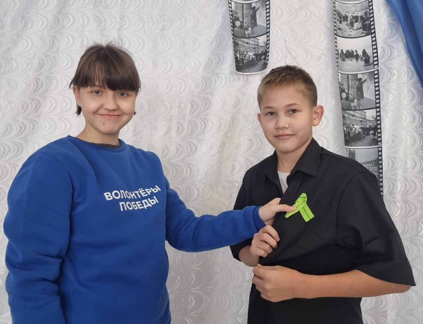 В школе проходит акция «ЛЕНТОЧКА ЛЕНИНГРАДСКОЙ ПОБЕДЫ» Волонтёры вручают учащимся и сотрудникам двуцветные ленточки. Оливковый символизирует триумф Победы, зелёный олицетворяет жизнь, пробившуюся сквозь боль и разрушения.